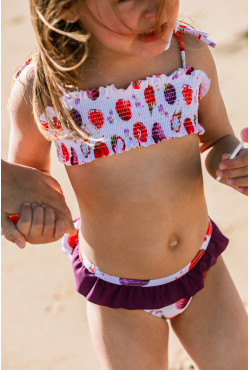 Top de gomas ideal para convertir en biquini cualquier culetín. Se abrocha con lacitos en el hombro.